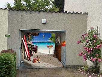 Оформить можно даже двери и окна в доме, двери в гараж. При этом окна и двери со стеклом можно оформить как витражи. Кстати, рекомендуем от сильных солнечных лучей спасаться не сплошным заклеиванием окон, а с изображением красивых видов.
